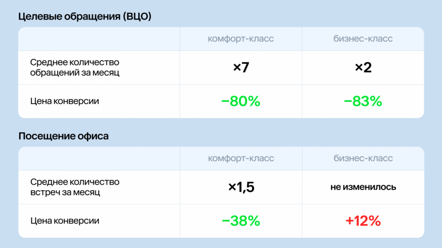 У квиз-страниц есть выраженная специфика: чем выше класс жилья, тем ниже эффективность формата. Сравним данные по размещениям комфорт- и бизнес-класса по двум параметрам: целевым обращениям и посещениям офиса застройщика.