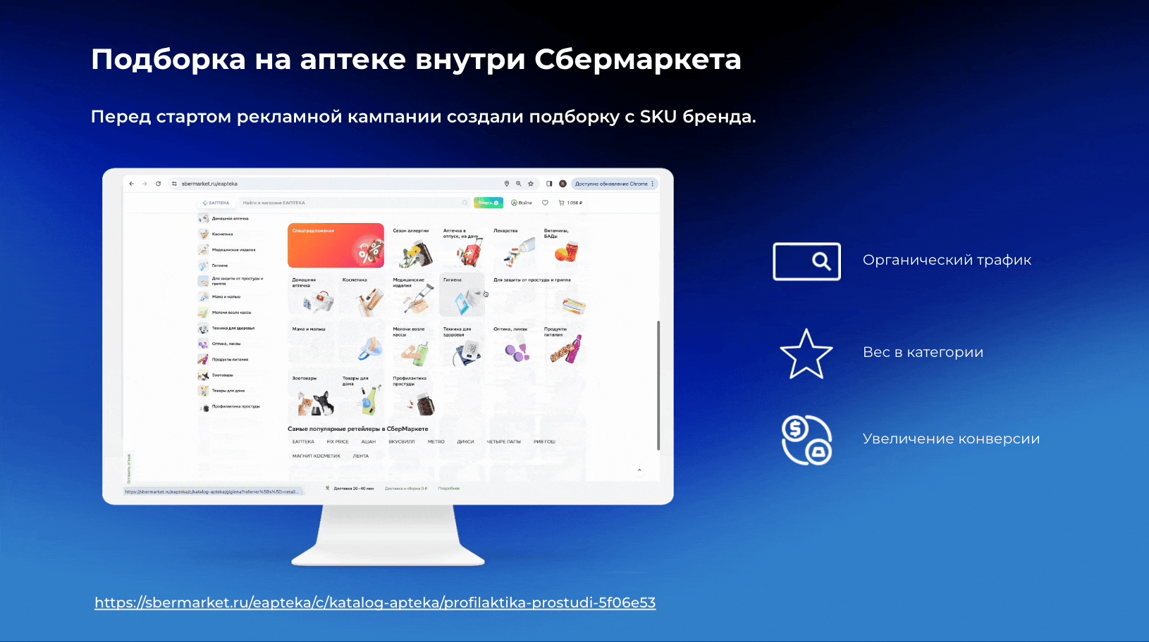 Четвёртый секрет — волшебная кнопка. Мы не просто создали подборку с SKU препарата внутри «Сбермаркета» и включили дополнительную кнопку «профилактика простуды». А специально создали фасетную категорию каталога первого уровня, которая размещается в дереве каталога онлайн ритейлера. Подобные категории создают дополнительные тач поинты для входа в продвигаемый бренд, а также увеличивают вес бренда в общем каталоге онлайн-ритейлера, что влияет на его позиции в материнской категории в долгосрочной перспективе. По принципу классических маркетплейсов — чем больше каталожных фасетов создается для определённых товаров, тем выше их вес в основных категориях, что в итоге влияет на их органическое ранжирование на площадке. Благодаря этому механизму мы получили дополнительную органику.