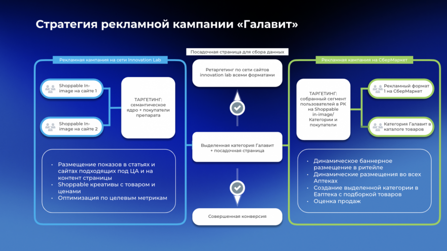 Мы ранее уже работали с коллегами из Innovation Lab, поэтому, когда к нам пришли с предложением протестировать новый продукт, мы естественно согласились. Нам было важно не только показывать Галавит людям, интересующимся простудной тематикой, но и приводить их к покупке, используя сегмент аудитории, которые ранее видели наше in-image размещение. Само размещение привлекло нас возможностью совмещать технологии программатик-размещения с e-comm средой и расширять таргетинги, обогащая классические программатик-инструменты датой маркетплейсов.