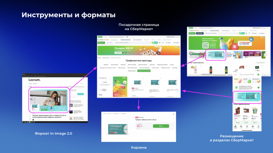 Третий секрет — включение инструментов «Сбермаркета» в экосистему кампании. Внешний трафик поступал на посадочную маркетплейса с in-image баннеров сети Innovation Lab. А шторки и баннеры внутри «Сбермаркета» использовались для управления органическим трафиком и построения дополнительных воронок. Таким образом мы получили внутренние анонсы на маркетплейсе и внешний таргетированный трафик, ведущий на посадочную с подборкой SKU. Такое взаимодействие охватывает трафик «со всех» сторон, что приводит к более высокому результату.