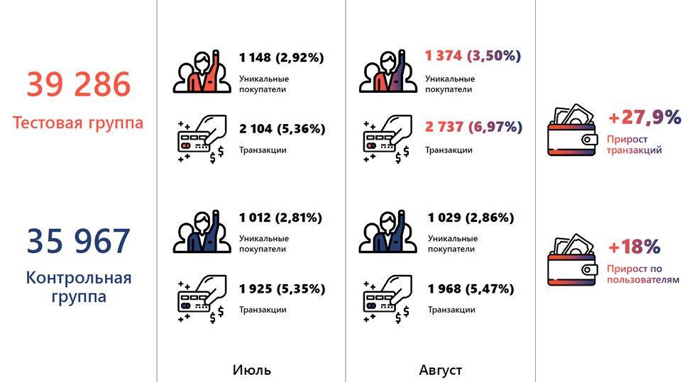 Третий этап — аналитика данных за период рекламной кампании. Тут увидели, как изменилось поведение двух групп. За период РК тестовая совершила 2 737 (6,97%) транзакций и показала рост в 30%. Контрольная тоже выросла, но на 2,2%, совершив за этот же период 1 968 (5,47%) транзакций. Параллельно измерялся и рост уникальных пользователей. Например, тестовая группа выросла на ~20% с 1 148 (2,92%) до 1 374 (3,5%) уникальных покупателей. При этом контрольная — только на 1,7% с 1 012 (2,81%) до 1 029 (2,86%).
