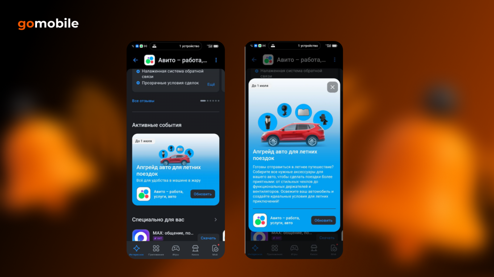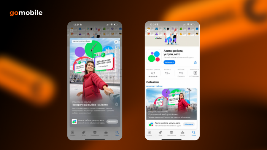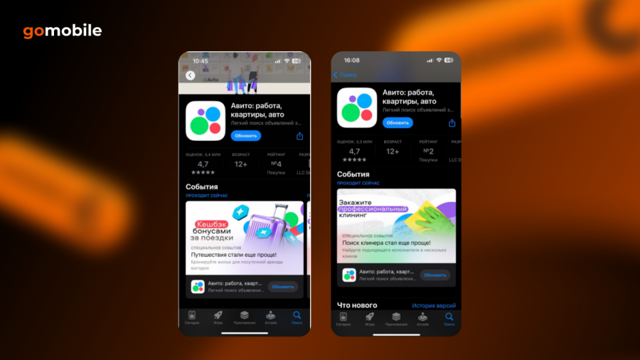 «Авито» — сервис для размещения объявлений в различных категориях: работа, товары, недвижимость, услуги и авто. Из-за многовертикальной структуры приложения его продвижение в сторах является более сложным и трудоемким процессом, поэтому «Авито» обратилось к Go Mobile.