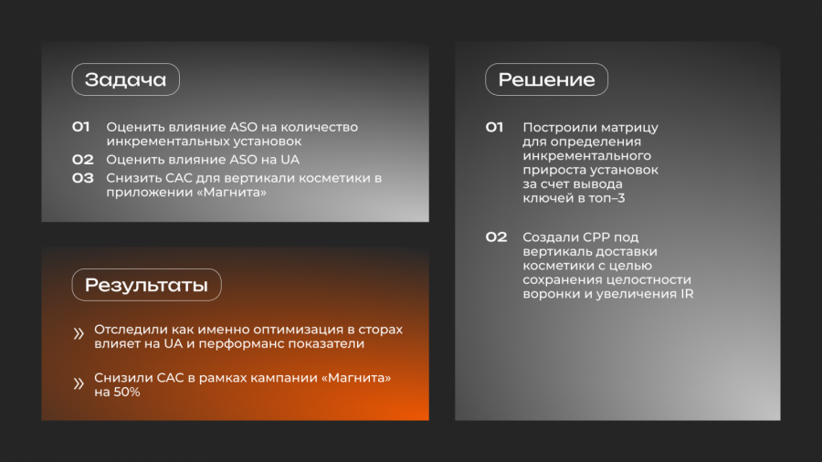 - Улучшение перформанс показателей — CR, IR и CPI, а также снижение стоимости привлечения пользователя. Этот этап мы протестировали в рамках кампании по продвижению вертикали доставки косметики в приложении «Магнита».