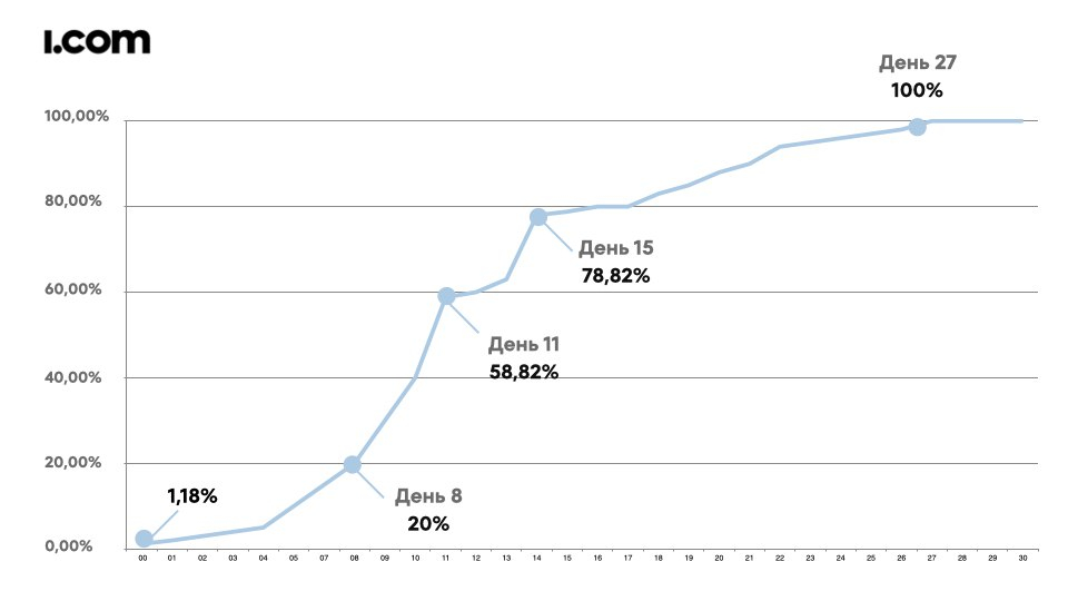 На начальном этапе i.com поставило низкую среднюю стоимость конверсии. Далее в несколько этапов увеличили ее в 1,5 раза. Шаг увеличения ставки не превышал 20−30% за 2−3 дня, чтобы плавно масштабировать кампанию без переобучения алгоритмов.