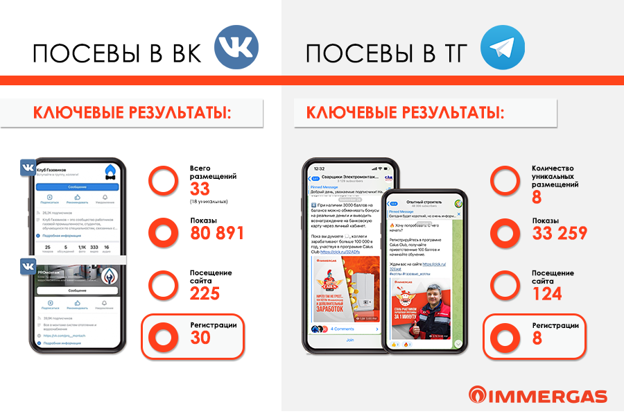 Сидинг во «ВКонтакте» и Telegram. За период рекламной кампании было размещено 33 поста во «ВКонтакте», в том числе 18 уникальных, и восемь постов в Telegram с суммарным охватом 114 150. Сидинг во «ВКонтакте» сработал эффективнее Telegram: там больше узко специализированных тематических сообществ для газовиков, сантехников и монтажников. Каналы в Telegram ориентированы на более широкую аудиторию, и размещения у них показали низкую конверсию, хотя стоили дороже: 2275 руб. в Telegram против 480 руб. во «ВКонтакте». Поэтому в ходе кампании мы приняли решение скорректировать контент-план и увеличить число интеграций в сообществах «ВКонтакте».