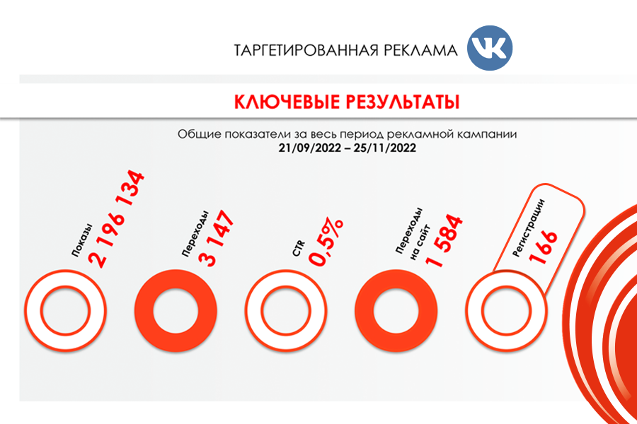 Таргетинг во «ВКонтакте». Ядро проекта сосредоточено во «ВКонтакте», поэтому таргетированная реклама в этой сети оказалась наиболее эффективной: принесла 166 регистраций в программе и суммарно охватила более 500 тыс. пользователей. В «Одноклассниках» целевого трафика по переходам оказалось меньше.