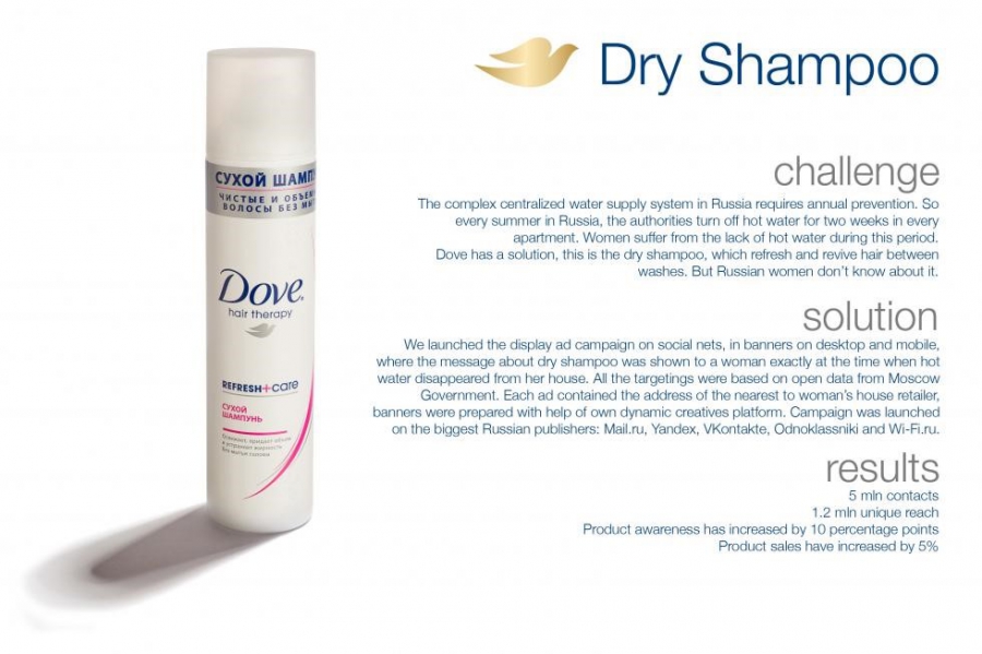 У бренда Dove есть решение — сухой шампунь, который позволяет волосам выглядеть более чистыми и объёмными без использования воды. Но далеко не все женщины знают об этом средстве. Мы предложили в летний период таргетинг digital рекламы этого шампуня по необычному критерию — графику отключения горячей воды. Идея, казалось бы, лежала на поверхности, но нужно было просто ее грамотно использовать.