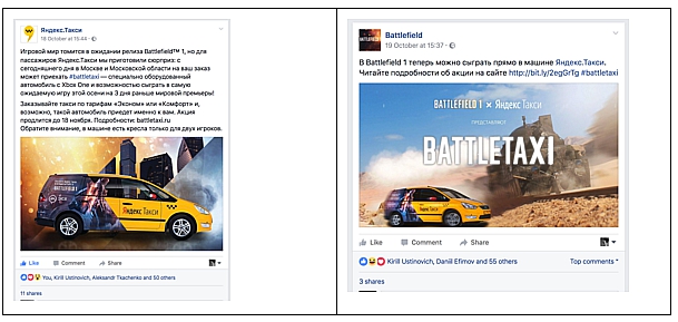 Плюс к этому, посты об акции были опубликованы в официальных группах Battlefield (VK/FB) и Яндекс.Такси (VK/FB/Insta):