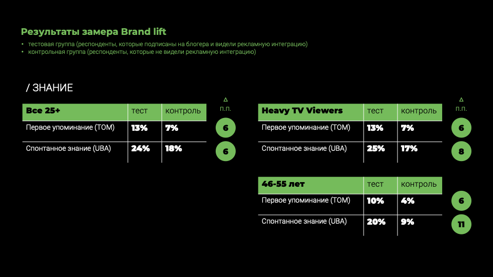 При этом интересным является тот факт, что максимальная разница по спонтанному знанию была зафиксирована в сегментах Heavy TV Viewers (+8 п.п.) и 46−55 лет (+11 п.п.).