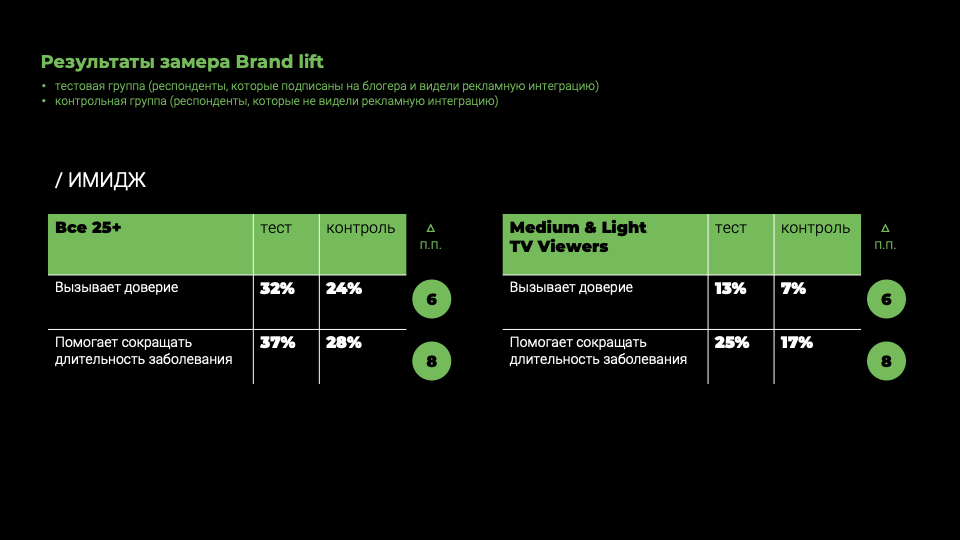 Доверие — один из ключевых показателей в целом на фармацевтическом рынке — в тестовой группе оказался выше на 8 п.п., чем в контрольной группе (32% против 24%). Это говорит о том, что хоть креатив и был фиксированным, но само соседство с контентом блогера улучшило восприятие аудитории.