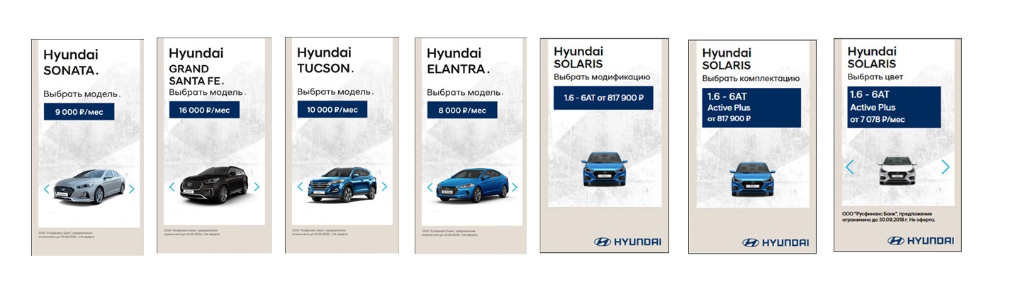 Совместно со специалистами Hyundai мы разработали ленту с изображениями автомобилей всех марок и комплектаций, в которой прописаны все сценарии поведения посетителя сайта.