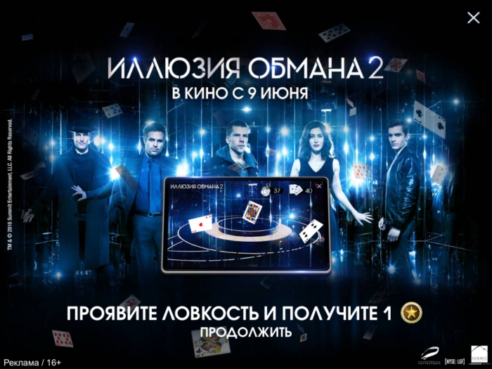 Перед нами стояла задача поддержать новый фильм «Иллюзия обмана 2» и максимально вовлечь аудиторию в рекламную кампанию. А что может быть лучше интерактивной игровой механики, органично интегрированной в самые популярные и любимые пользователями всего мира игры компании Gameloft? Только формат брендированной рич медиа мини-игры.