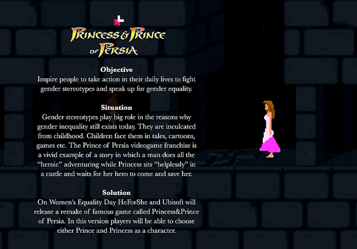 В целом о Young Glory. Это, вероятно, самый долгий и один из сложнейших креативных фестивалей. Он длится 8 месяцев (с сентября по апрель), в каждом из которых дается новый бриф. Задачи в основном социальные. Например, в январе нам предстояло придумать, как от имени фонда HeForShe донести до прогрессивной общественности проблему гендерного неравенства. Но были брифы и с коммерческим уклоном: например, создать кампанию, которая заставит молодежь отвлечься от блогеров и сериалов в пользу спортивных трансляций. Брифы дают креативные директора различных знаменитых агентств, таких как W+K, TBWA, J. Walter Thompson и других. Они же и оценивают работы.