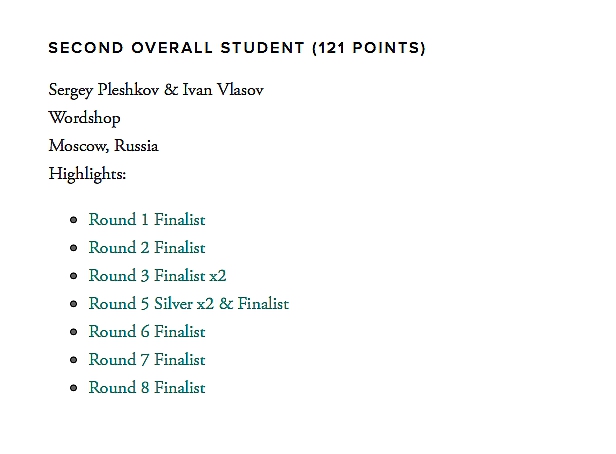 И все-таки, несмотря на то, что результаты многих отдельно взятых раундов казались нам весьма неожиданными и субъективными, хочется надеяться, что ежемесячное попадание в списки лидеров является объективным свидетельством наших возможностей. За это мы искренне благодарим Wordshop! Отдельное спасибо преподавателям Леониду Фейгину, который буквально стал нашим креативным крестным отцом, Юлиану Суетину, чей вопрос “В чём идея?” до сих пор звенит в ушах и, директору Академии, Светлане Майбродской, благодаря которой все это стало возможным! А также за вдохновляющие примеры выпускников Академии на этом фестивале, которые единственные в России дважды выигрывали золото!