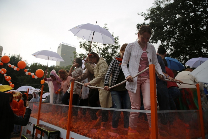 По задумке участники мероприятия должны были пройтись по горе мандаринов и выжать из них самое большое количество мандаринового сока в мире.