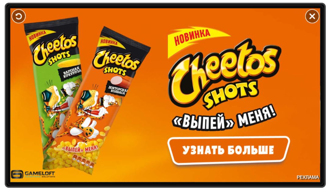 Чтобы сделать рекламу более вовлекающей, Gameloft предложили преобразовать видеоролик, добавив в него интерактивные элементы. Этот рекламный формат впервые использовали в России для кампании Cheetos Shots.