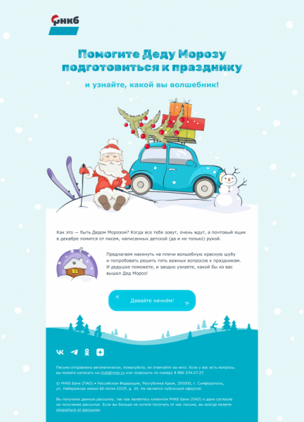 После каждого результата пользователю предлагали узнать побольше о кредитной карте РНКБ, с помощью которой он точно станет самым практичным, красивым или заботливым Дедом Морозом.