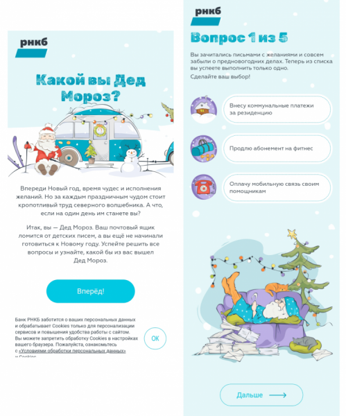 Агентство CRM-маркетинга EMAILMATRIX сделало новогодний спецпроект для банка РНКБ в формате квиза. Процент вовлеченных людей, которые прошли тест до самого конца, составил 84,6%, а 2,5% пользователей, которые зашли на страницу квиза, оставили заявку на кредитную карту. Команда агентства поделилась с Sostav деталями реализации проекта.
