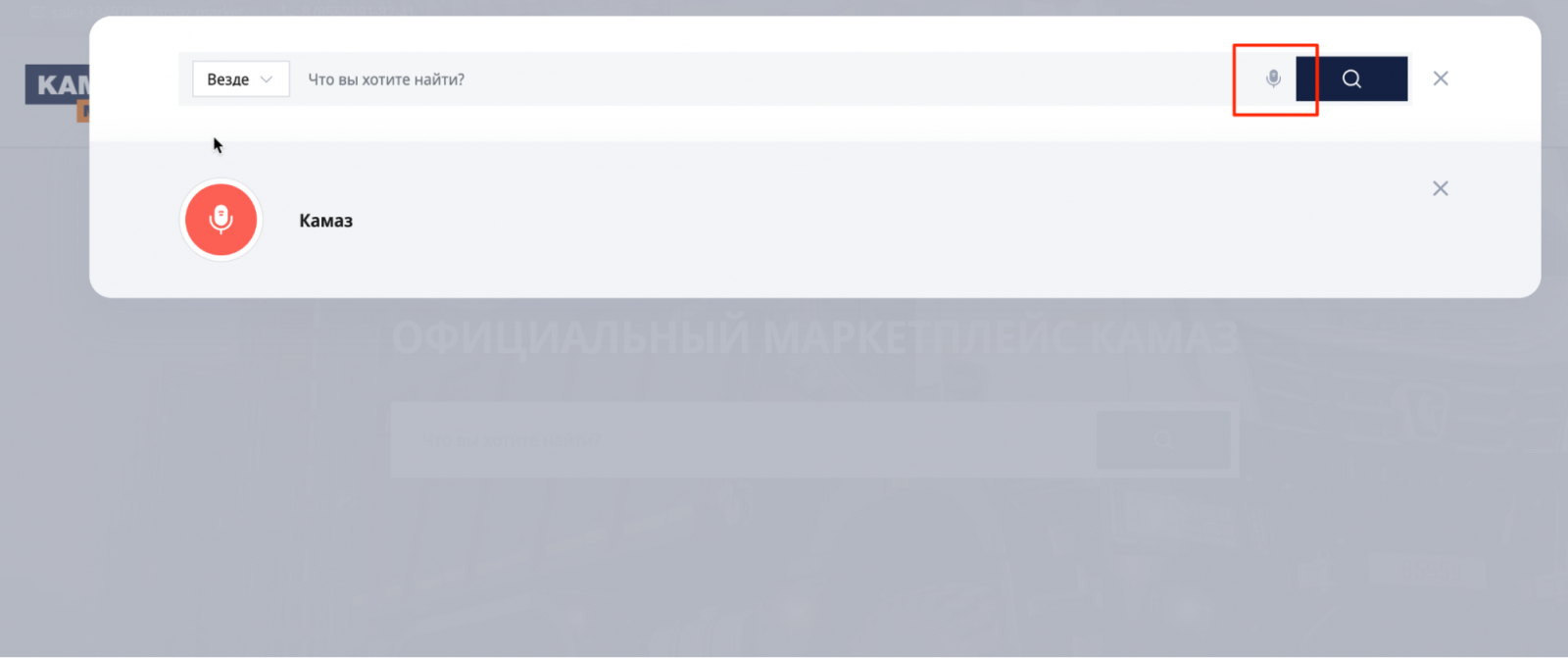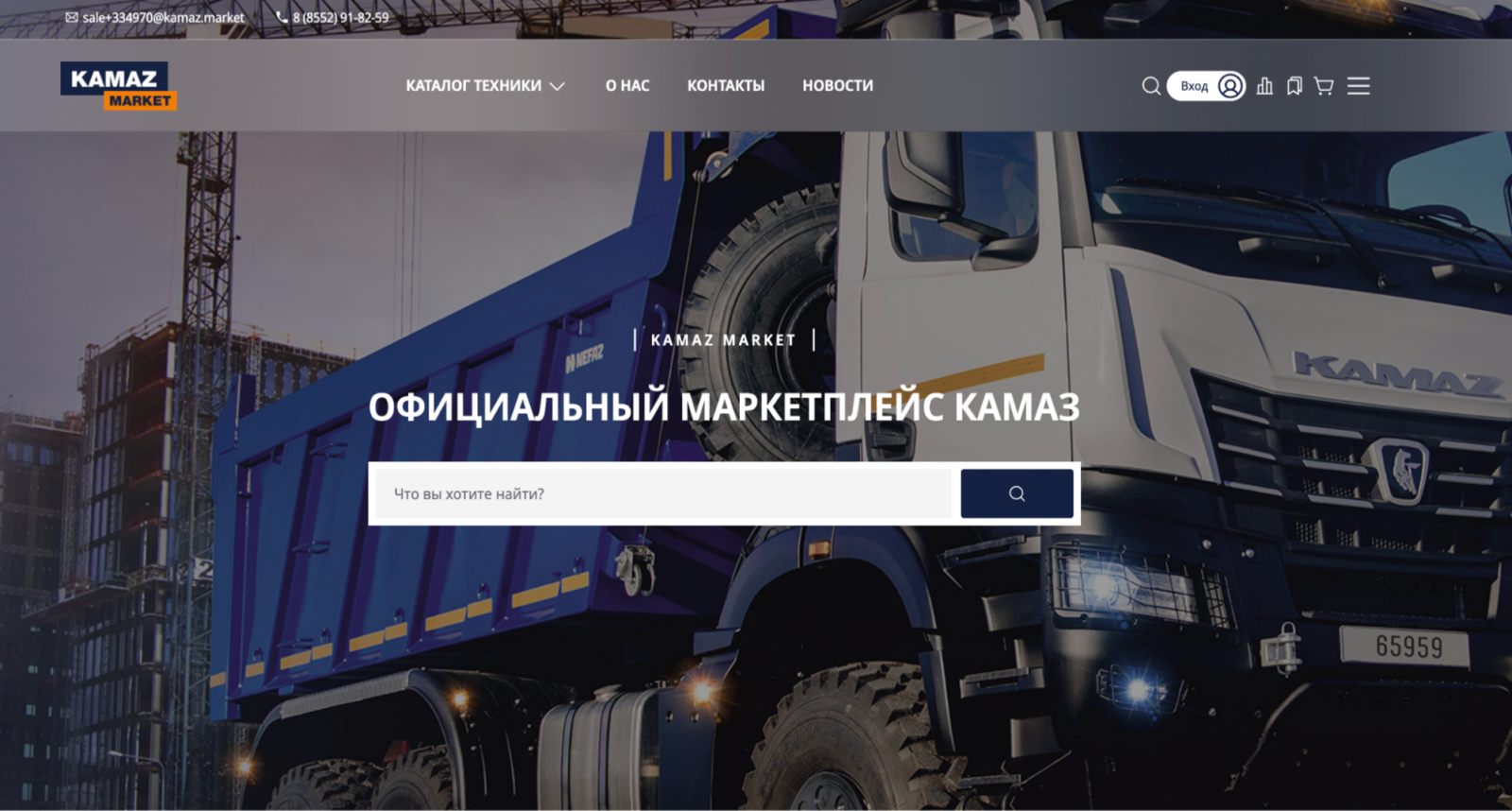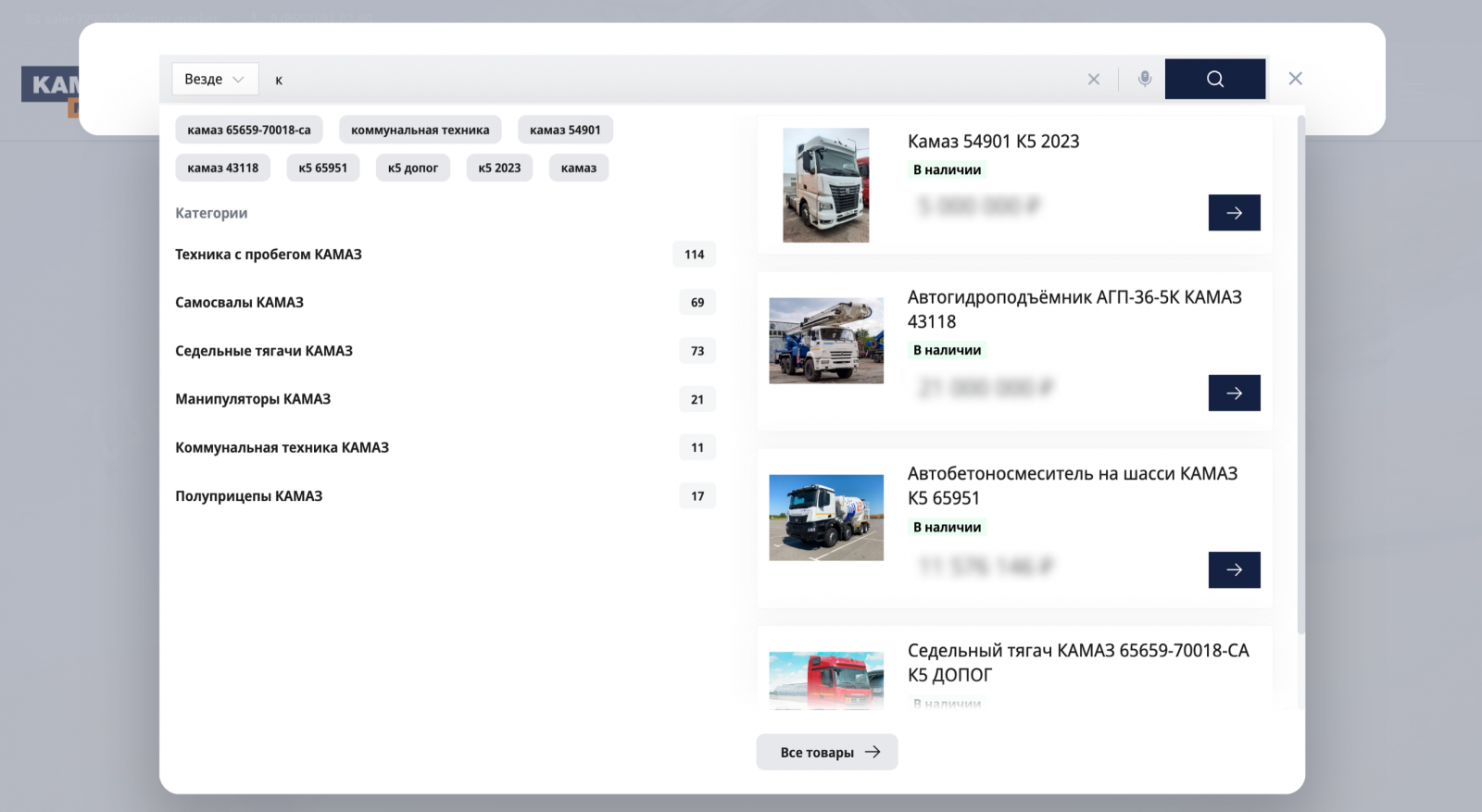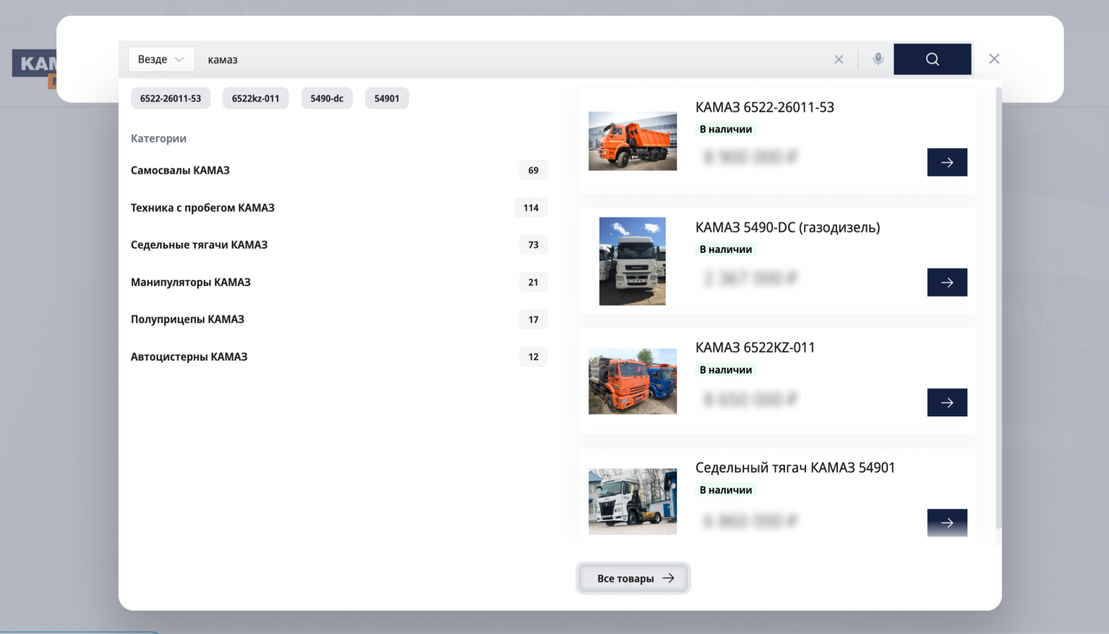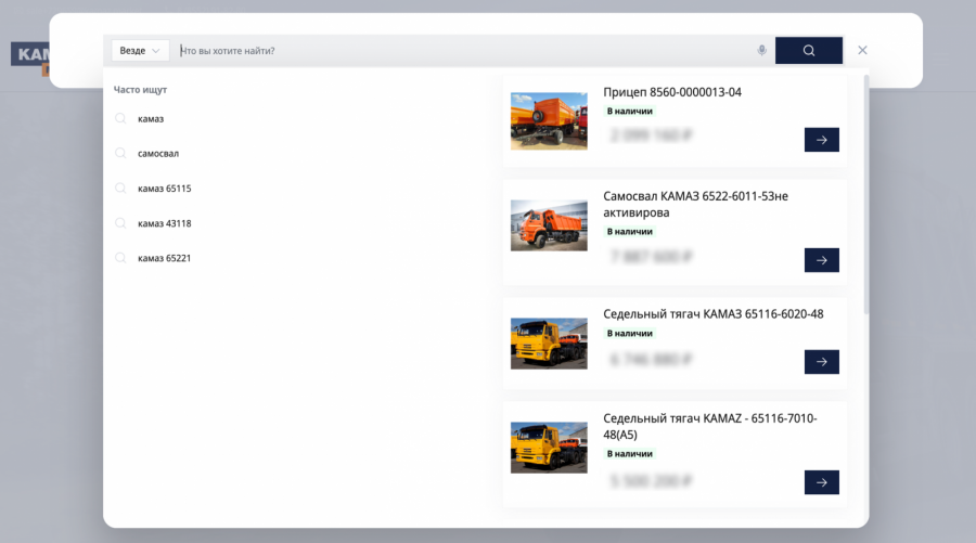 - В рамках обновления был изменен дизайн поискового виджета с учетом фирменного дизайн-стиля kamaz.market. Поиск органично вписался в визуальную концепцию сайта и стал выглядеть как нативная часть интерфейса.