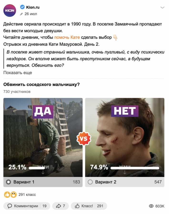 Для этого команда дала аудитории возможность почувствовать себя следователями и придумала интерактив с поиском улик. В постах, которые выходили на официальной странице Kion в «Одноклассниках», связанных и не связанных с «Замаячным», прятались символы-пасхалки. В течение дня специалисты просили находить эти символы и писать о них под отдельным постом. Победитель получил промокод на подписку.
