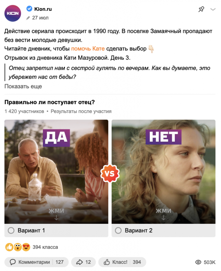 Механики, завязанные на сюжете или основной канве медиапроекта, находят отклик у совершенно разных целевых аудиторий. Это выражается в росте охватов, числа подписчиков группы, а также их вовлеченности и уровне лояльности. Если контент интересен и выдается дозировано, это будет мотивировать людей возвращаться в группу за новыми впечатлениями самостоятельно, что снизит затраты на рекламное привлечение новых пользователей. Аудитории «Одноклассников» очень «заходят» оригинальные механики проектов, и люди органически возвращаются в группу, подписываются на неё, участвуют в вовлекающих проектах. Такая совокупность факторов решает задачи бизнеса и на конкретной площадке, и в рамках всего проекта.