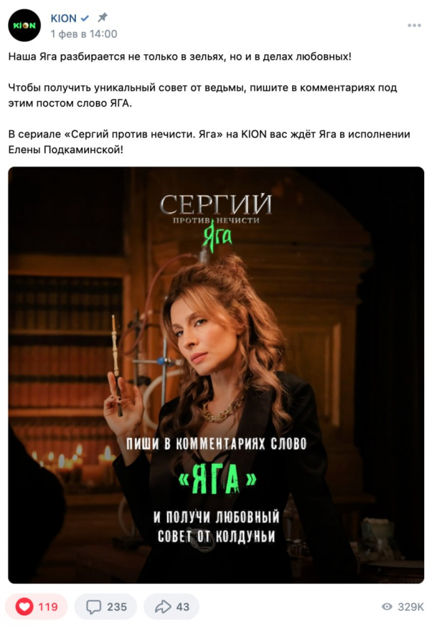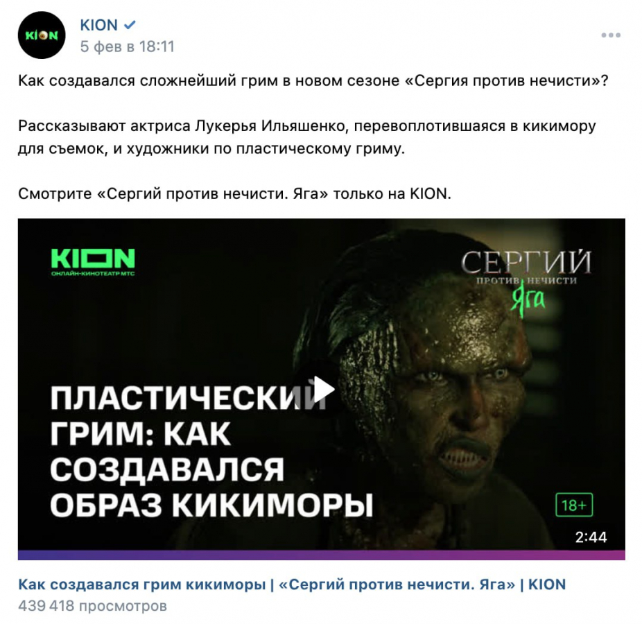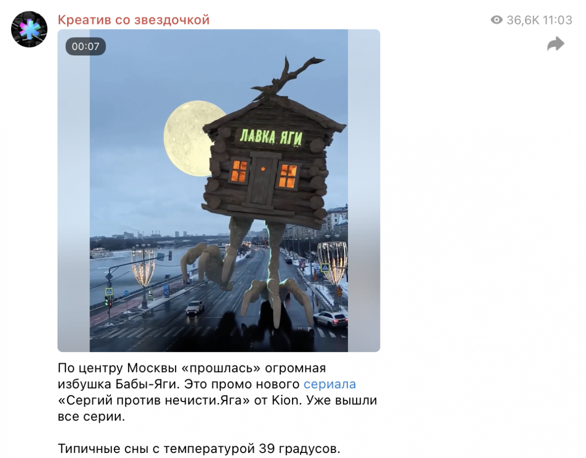 В запуске подобного фэнтези-проекта мы решили использовать социальные сети KION как плацдарм для экспериментов и запустили промо с использованием дополненной реальности. Так как тематика сериала — нечисть и охота за ней, решили обыграть эту тему в креативе и отправили избушку на курьих ножках гулять по оживленным улицам Москвы. Кампания сработала эффективно: ролик стал вирусным и обратил на себя внимание пабликов в социальных сетях.