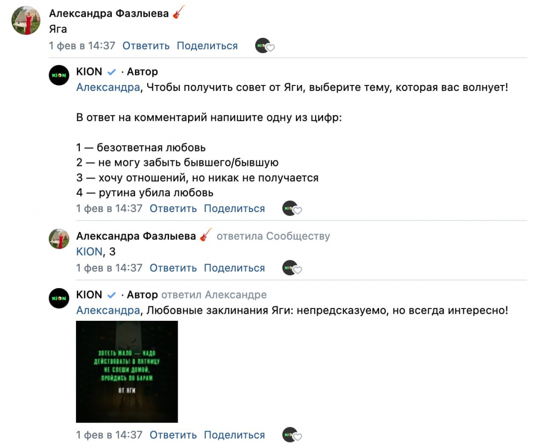 А Баба-Яга тем временем раздавала любовные советы. Для этого в комментариях под постом был настроен чат-бот. В нем можно было получить ответ на одну из волнующих тем: безответная любовь, как забыть бывшего или бывшую, что делать, если хочется отношений, но не получается их завести, и как справиться с тем, что рутина убила любовь.