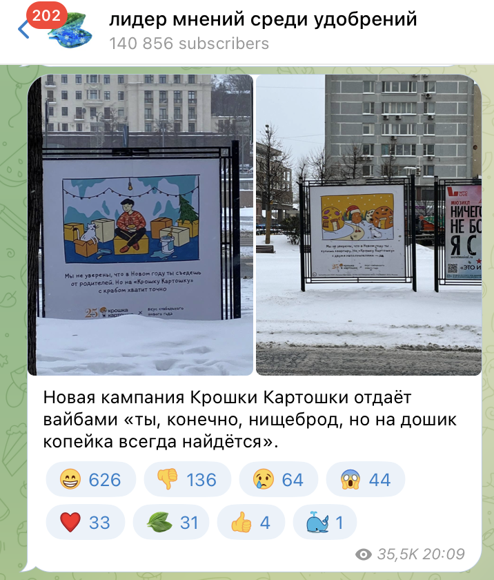В предпраздничный период команде «Крошки Картошки» было важно создать цепляющую кампанию, которая выделится на фоне остальных в новогодней суете, привлечёт внимание аудитории и подсветит ценности бренда. «При этом рекламой с классическими новогодними атрибутами уже никого не удивить. Решение — неоднозначная кампания, о которой будут говорить», — рассказала команда агентства.