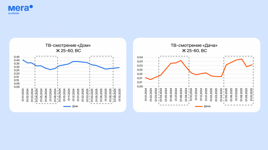 «Лента» традиционно использует классическое телевидение как один из ключевых каналов коммуникации, обеспечивающий стабильные результаты. Однако анализ динамики телесмотрения за 2024−2025 годы показал, что поведение аудитории заметно меняется в зависимости от сезона.