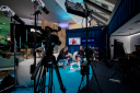Саму зону студии «Кибербез ТВ» оформили в формате open-space. Хотелось дать больше «воздуха» в кадре и функционально задействовать пространство студии под велком, бэкстейдж с техникой, грим-зону, техническую зону команды, а также сделать интерьер не только удобным, но и стильным. Формат open-space студии убрал визуальные барьеры от офлайн-участников и дал возможность онлайн-зрителям ощутить атмосферу форума.