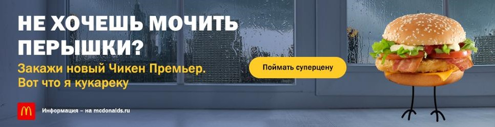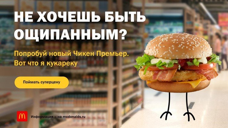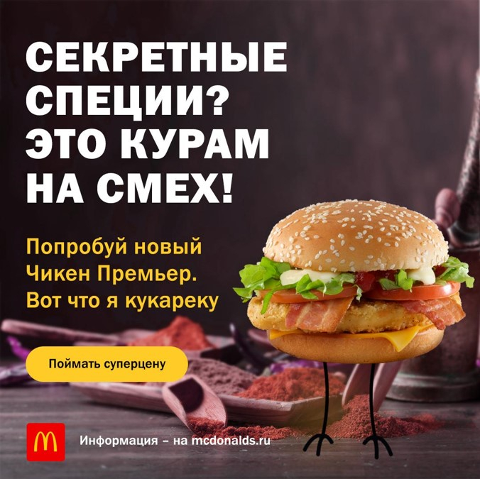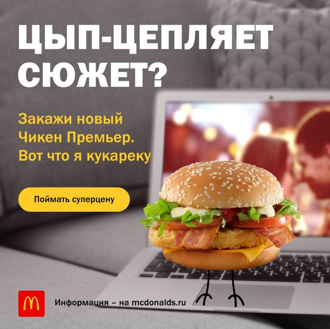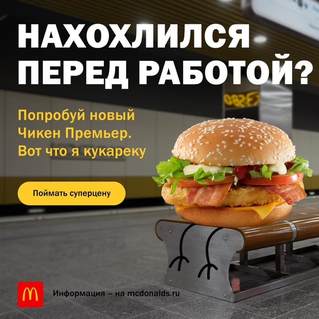 Leo Burnett Moscow и Digitas (входят в Publicis Groupe) запустили digital-кампанию с ситуативным креативом для своего клиента, одного из крупнейших российских рекламодателей — McDonald’s. Целевую аудиторию сегментировали по релевантным тачпоинтам в стратегической платформе Publicis Groupe — PACE. Перед агентствами стояла задача построить знание о новом бургере «Чикен Премьер» и увеличить вовлеченость пользователей через релевантное сообщение.