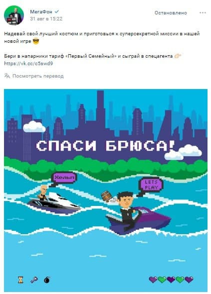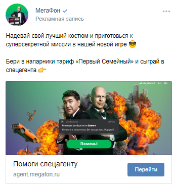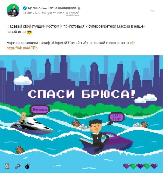 «МегаФон» разместил анонсы об игре в соцсетях — «ВКонтакте», Facebook и «Одноклассники». Во «ВКонтакте» и Facebook целью промо был трафик, поэтому в этих соцсетях KPI по CTR был перевыполнен на 150−190%.