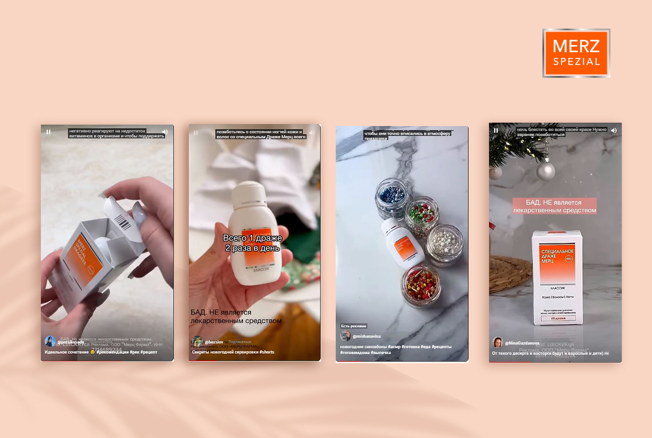 В рамках кампании в своих Shorts коммерческие блогеры делились рецептами блюд и секретами сервировки стола, а бартерные блогеры готовили или упоминали чиа-пудинг — при этом и те, и другие транслировали посыл о важности ухоженных рук в кадре и в жизни, а также рассказывали о «Специальном Драже Мерц» как о средстве, которое поможет встретить Новый год с красивыми ногтями. Три блогера дополнительно опубликовали по ролику с интеграцией продукта по собственной инициативе. Мы также взяли на себя маркировку размещений и передачу данных в ОРД.