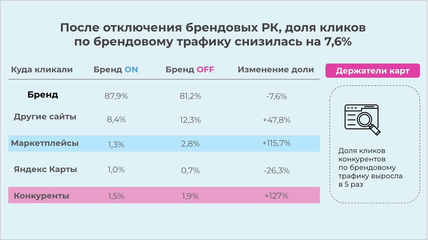 Дополнительно разложили выпавший трафик на новых и лояльных покупателей (на основе баз держателей карт). Получилось, что снижение трафика по новым клиентам составило 34%, а по лояльным — 7%. Таким образом, доля новых покупателей в бренде высокая и при отключении 34% новых пользователей ушло к конкурентам.