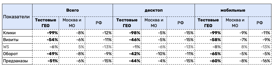 Общая картина показала, что отключение ГЕО привело к снижению ключевых показателей. По визитам оно составило — 54%, а по обороту — 49%. При этом в контрольных ГЕО и по WS таких изменений не произошло. Это потери от отключения бренда, которые не перетекли в SEO.