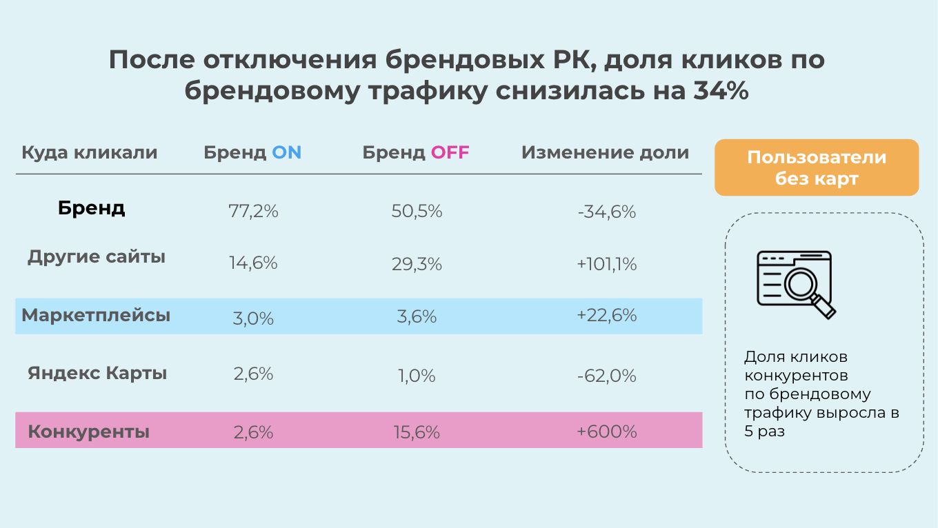 Тестирование показало, что при полном отказе от брендовой рекламы на поиске, органический трафик не полностью компенсирует потери в объеме аудитории.
