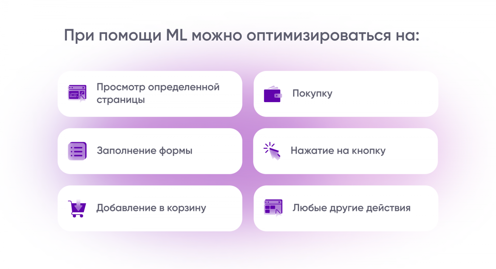 Важно отметить, что клиент самостоятельно определяет, какие конверсии учитывать, и оптимизация идёт уже на выбранные им события. При этом ML-модель продолжает непрерывно обучаться и улучшать перформанс-показатели на основе получаемых данных. А значит, и процесс снижения стоимости нужного нам действия тоже происходит непрерывно.