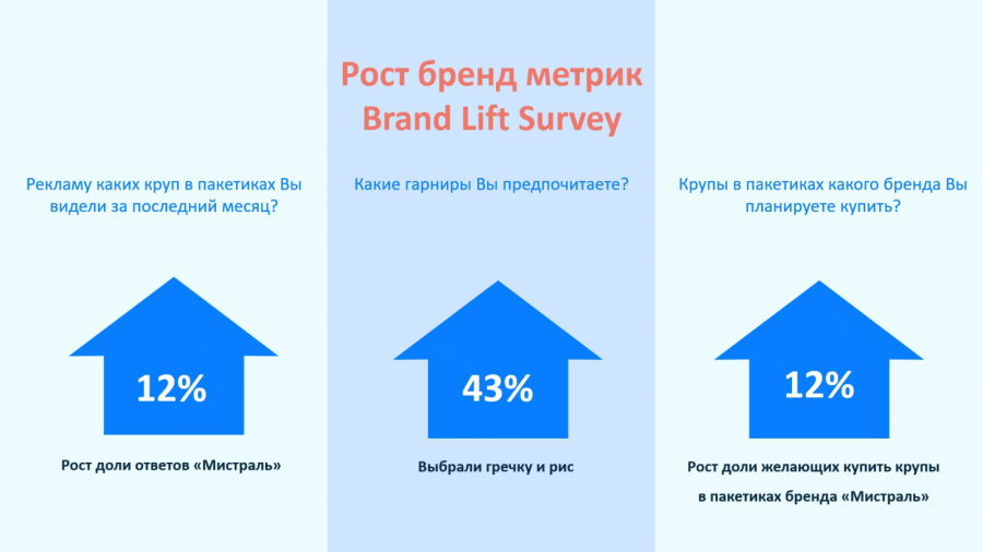 - видевшие рекламу на 12% более склонны к покупке круп в пакетиках бренда «Мистраль».
