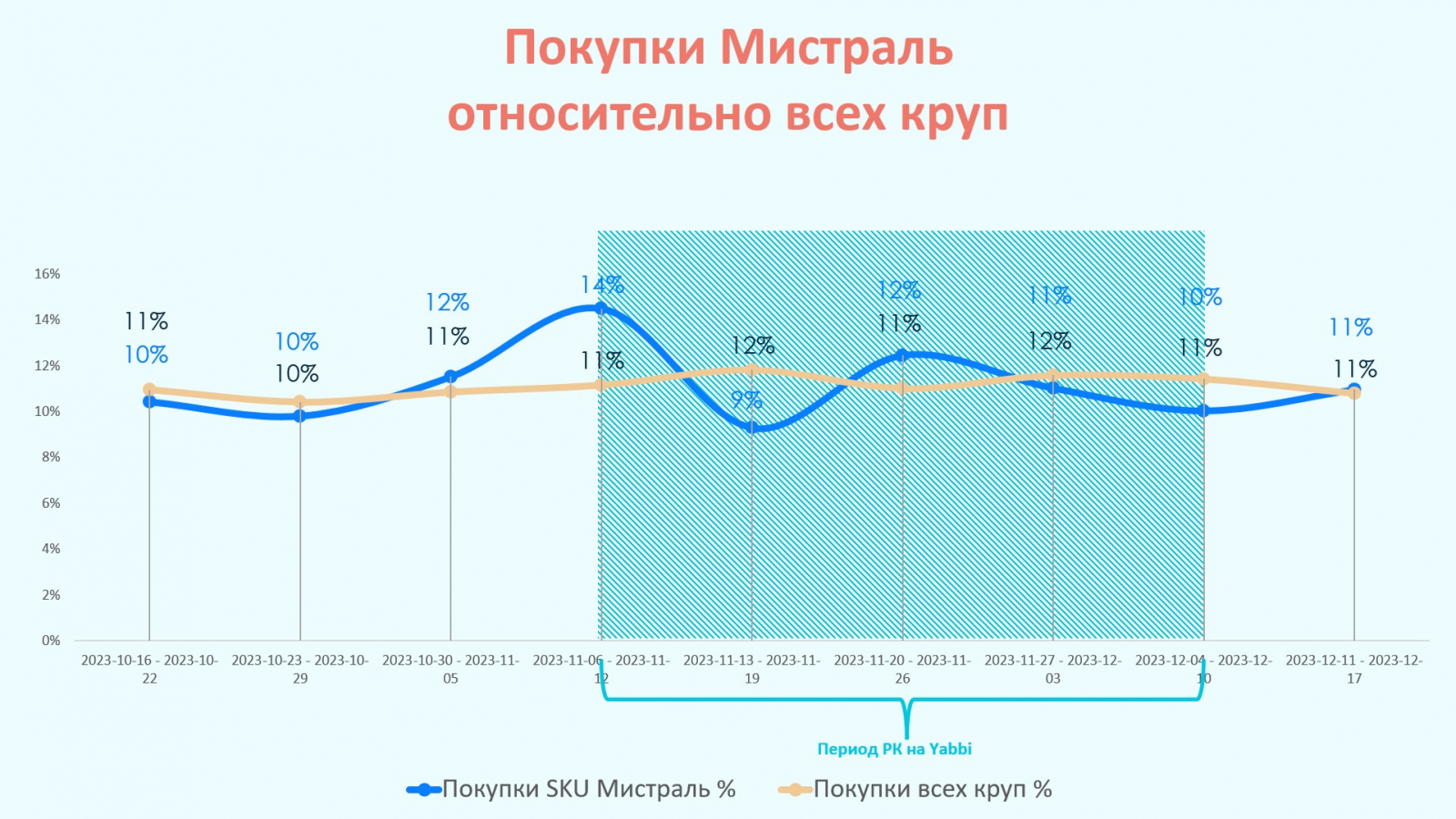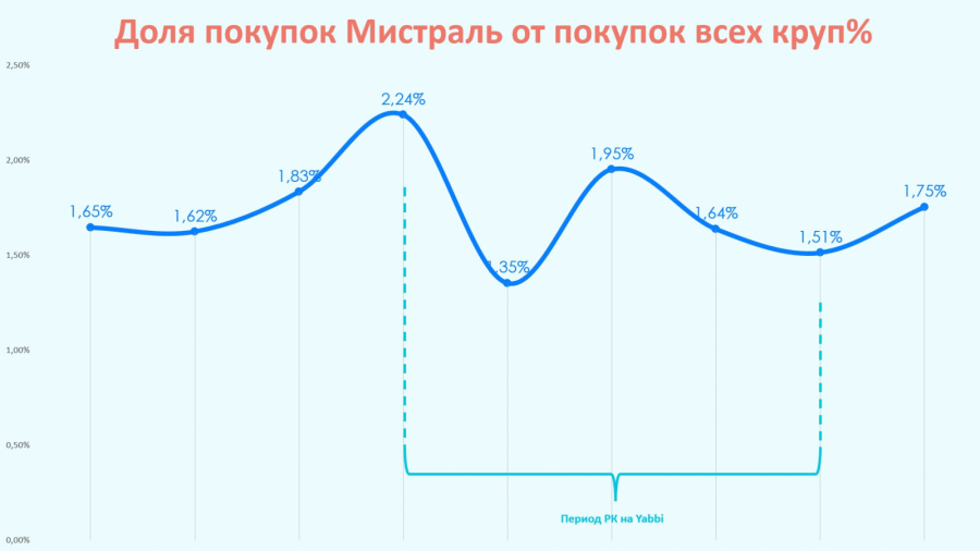 В количестве покупок «Мистраль» видна положительная динамика, коррелирующая с охватом РК на Yabbi с небольшим запозданием (окно принятия решения).