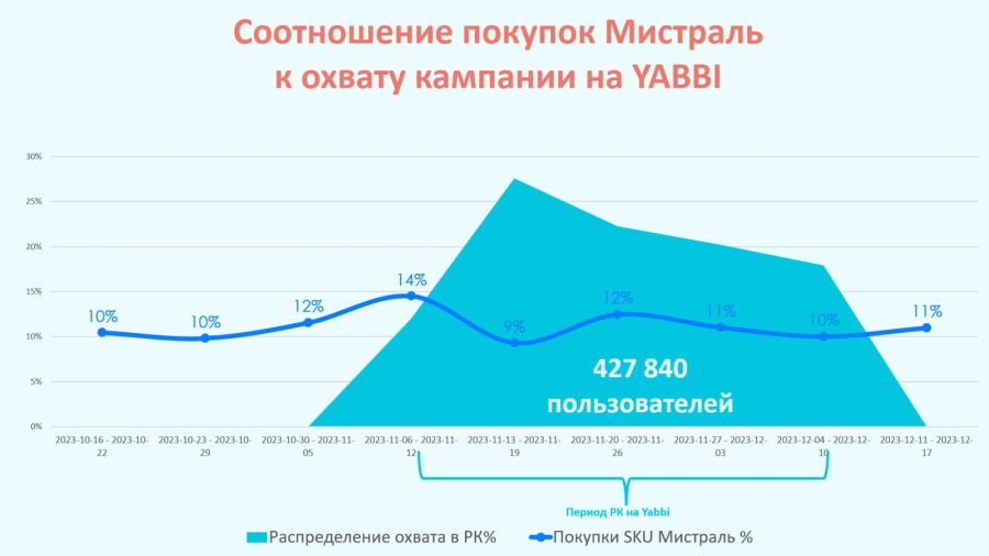По данным Sales Lift cреди видевших рекламу на Yabbi пиковый рост покупок по бренду «Мистраль» пришёлся на первую неделю размещения и составил 14%.