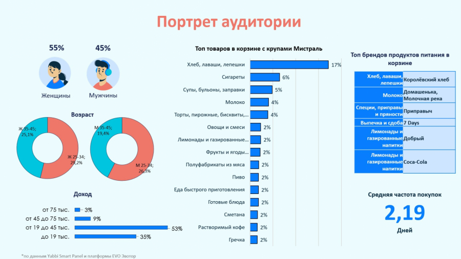 - Для контакта с ЦА был выбран таргетинг по данным касс «Эвотора» на покупателей круп в магазинах «у дома».