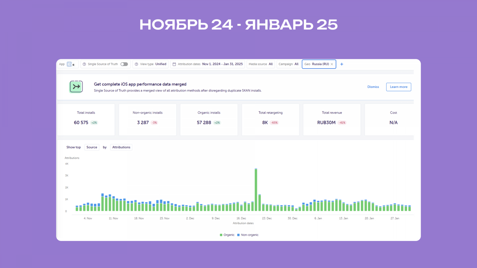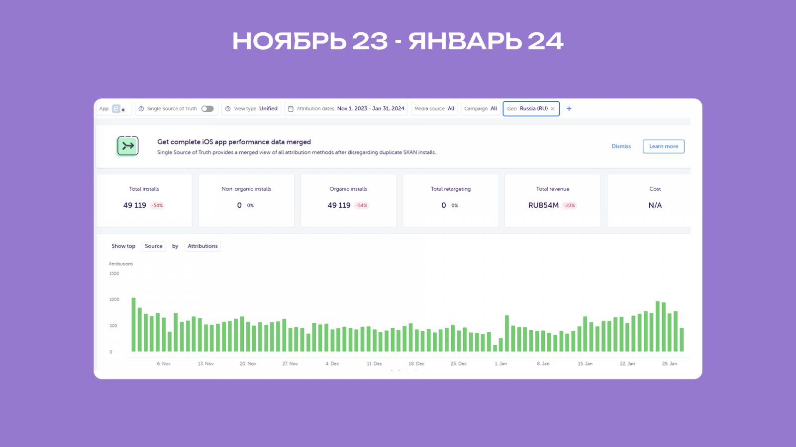 Рост органических установок составил +16,5%. Рассматривали период с ноября по январь (выбрали данный период, потому что в октябре начали проливать мотив с ретеншеном* второго дня и продолжаем до сих пор) по России.
