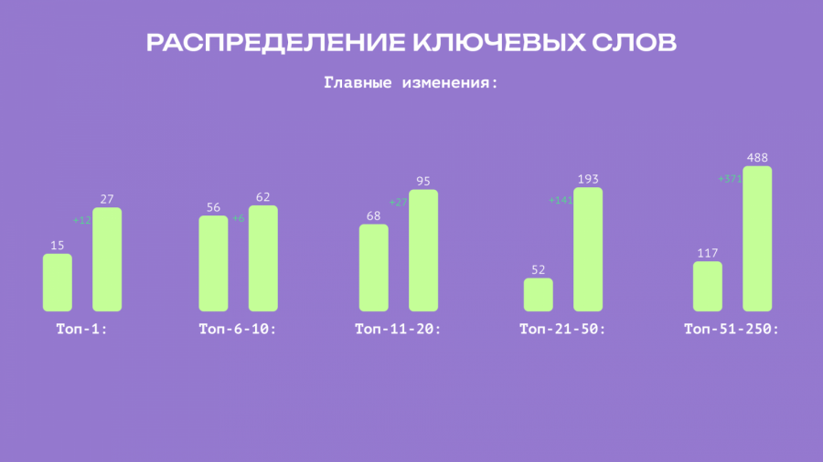 - Расширение семантического ядра (добавление новых слов, попадание в топ — 250).