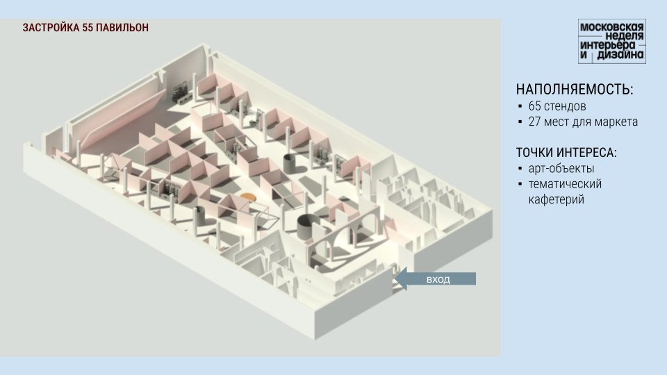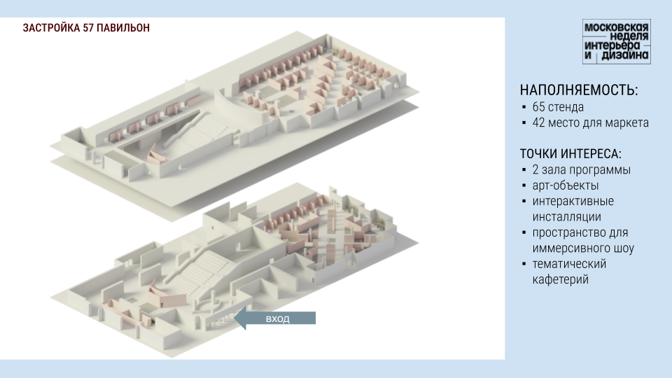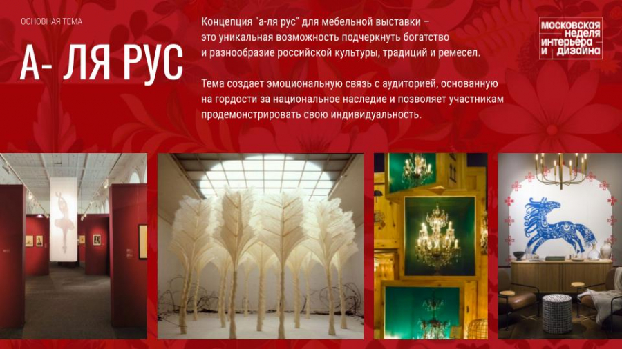 Затем мы вместе с экспертным советом формируем идеи по тематике выставки и отдаем на утверждение заказчику. Так, для пятой «Московской недели интерьера и дизайна» команда выбрала концепцию «А-ля рус» — тему, подчеркивающую богатство российской культуры и традиций.
