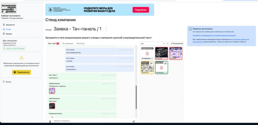 Путь экспонента начинается с подачи заявки. Компания сразу попадает в «воронку» внутри CRM и получает доступ к личному кабинету. Здесь участник видит полный справочник, требования к застройке стендов и референсы визуального оформления.