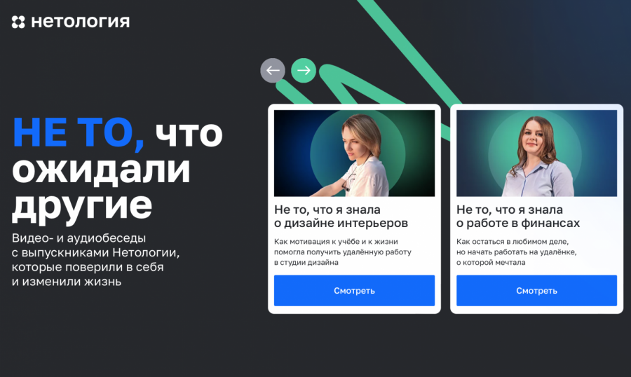 Также команда решила сделать спецпроект про студентов, которые отучились в «Нетологии» и рассказали о том, как новые знания повлияли на их карьеру и приблизили их к достижению целей. При этом выполнить решила ее не просто в формате стандартной «истории успеха», когда Edtech-проект снимает красивое вдохновляющее видео со своими выпускниками, а в виде мультимедийного комбо, добавив туда мини-подкасты, текст, видео и картинки, чтобы показать студентов живыми и задействовать как можно больше органов чувств аудитории.
