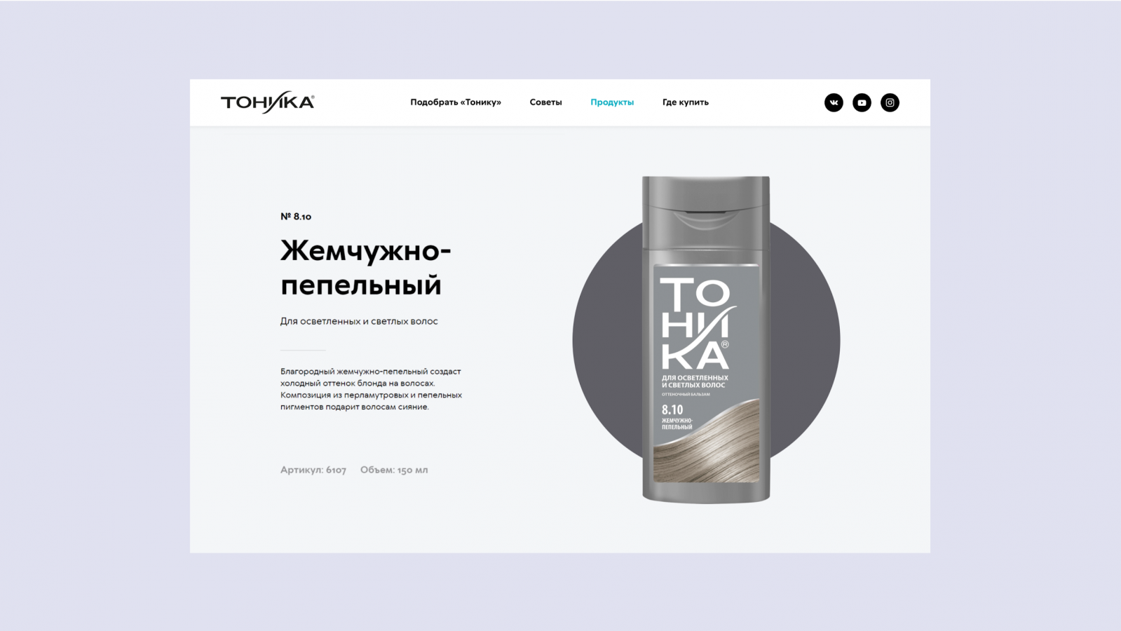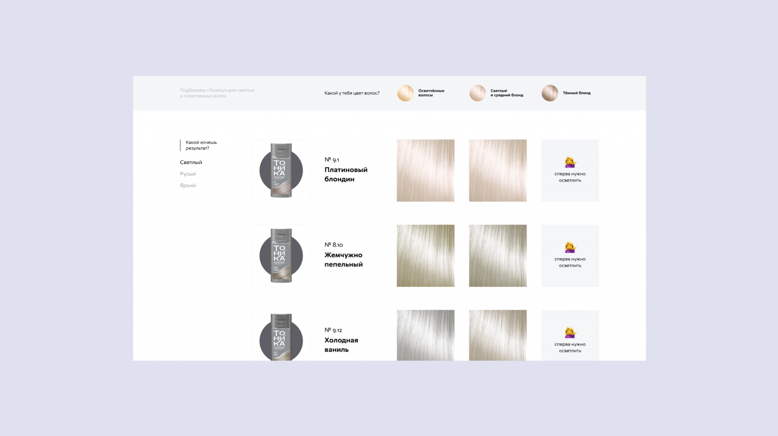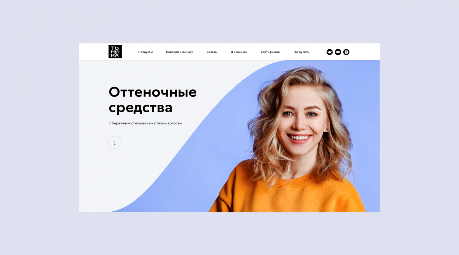 В дизайн-концепции нового сайта использовались элементы новой упаковки — плавные волны и мягкие контуры. Старый сайт не помогал покупателям выбрать подходящий продукт «Тоники», поэтому разработка нового сайта началась с продумывания такого функционала. Теперь пользователь может быстро подобрать оттенок под свой цвет волос и увидеть результат окрашивания.