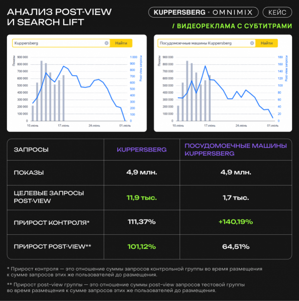 Рекламная кампания с субтитрами достигла высоких результатов как в охвате, так и в воздействии на аудиторию. Она способствовала значительному увеличению запросов как в контрольной, так и в post-view группах. Особенно эффективным оказался брендовый запрос «KUPPERSBERG», по которому было зафиксировано 11,9 тыс. целевых запросов post-view и прирост post-view на уровне 101,12%. Запрос «Посудомоечные машины KUPPERSBERG» также показал прирост контроля на уровне 140,19%, что свидетельствует о значительном интересе со стороны пользователей, которые не видели рекламу, но активность этих пользователей была ниже по сравнению с теми, кто видел рекламу.