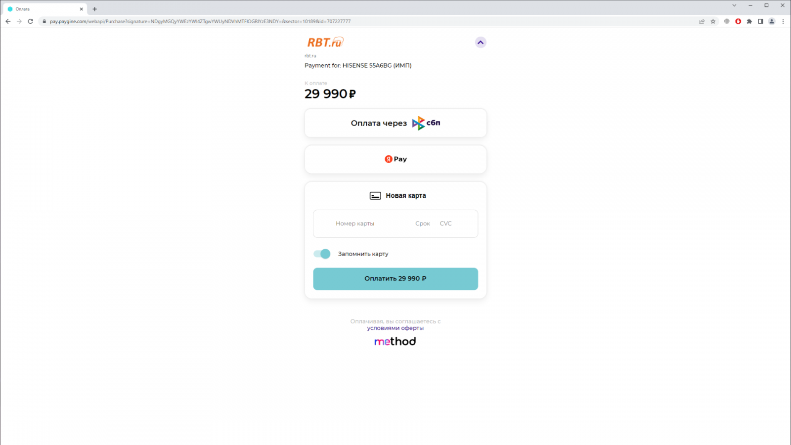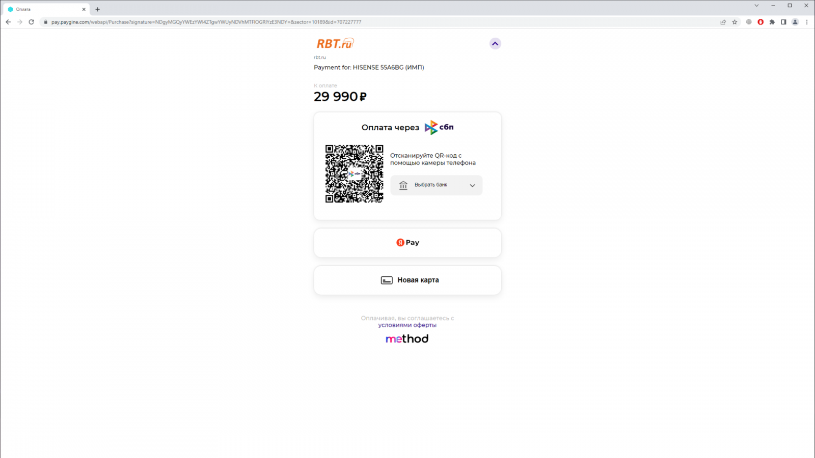 Мы предоставили партнёру платёжное решение, исходя из его потребностей. Оно представляет собой совокупность наиболее популярных способов проведения платежа, таких как СБП, Yandex Pay, Mir Pay и оплату картой с последующим её сохранением. Сервис позволяет производить оплату быстро, бесшовно и безопасно. На данный момент мы внедрили продукт на сайт магазина, а также мы будем рады предоставить Method для работы на физических точках бизнеса. Сейчас ведём переговоры на тему интеграции оплаты во всей офлайн-сети RBT.ru с помощью статических QR-кодов и NFC-чипов.