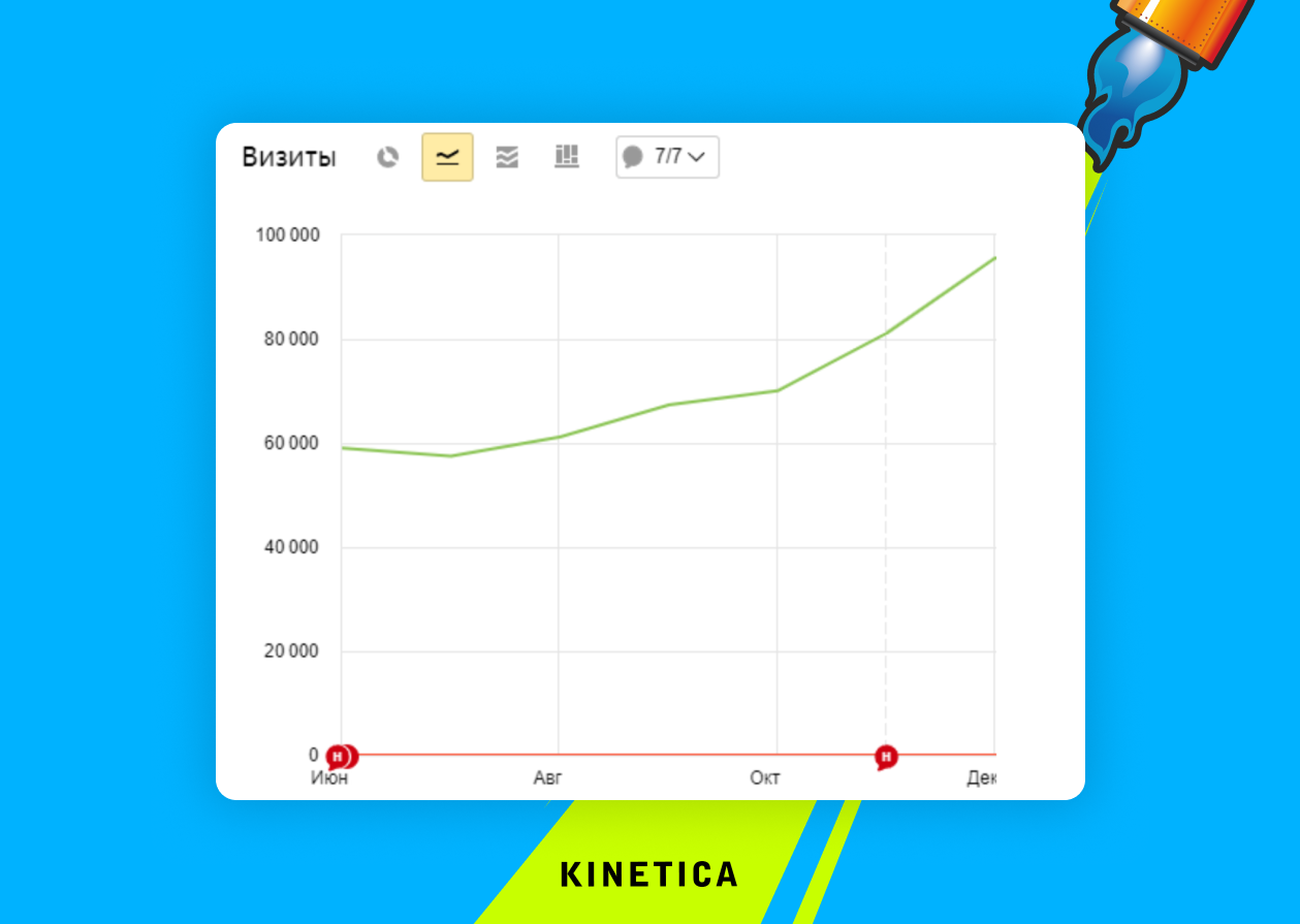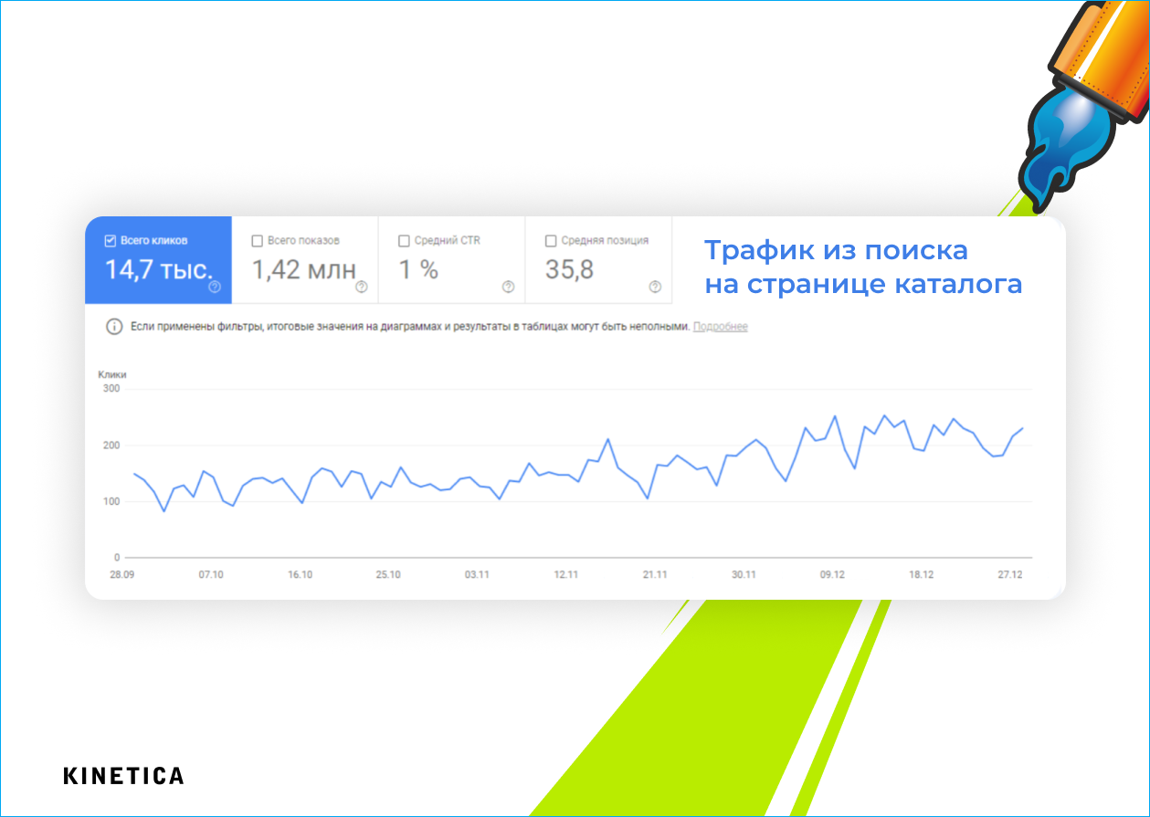Благодаря улучшению сканирования сайта и увеличению числа страниц в индексе, внесенные технические и контентные рекомендации стали приносить свои плоды. Органический трафик вырос на 62%: с 59 тыс. в июне до 95,5 тыс. в декабре.